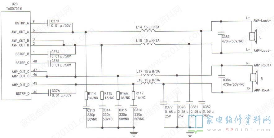 拆机检查,开机后声音正常,测得扬声器接线端(L+、L-、R+、R- )的电压均为6.1V。为让故障快速出现,用热风枪(置于100°C)加热U28及其外围电路,约1min后突然无声,此时测得L+、L-端电压均为0.65V,R+、R-端电压均为6.1V,显然L声道异常。