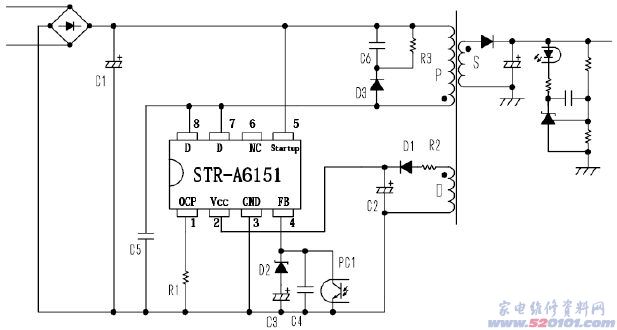 3)过负载保护电路STR-A6159M,和原边的过电流保护(OCP)电路分开,内置了过负载保护(OLP)电路。过负载保护电路的功能是,当负载边发生异常时,如果过负载状态(OCP动作使漏极电流处于被限制的状态)持续一定的时间,会使振荡动作停止。