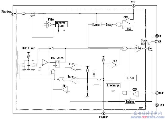 ⑩:丰富的保护功能A:PulseByPulse过电流保护电路(OCP);B:过负载保护(OLP),自动恢复;C:过电压保护(OVP),锁定方式;D:过热保护(TSD),锁定方式。