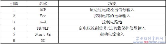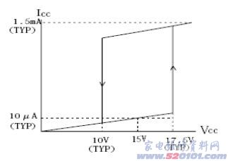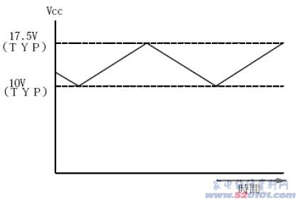 Vcc端子Vcc端子电压和电路电流的关系如图2-4所示,控制电路开始动作之前的电路电流被控制在Icc(OFF)=10μA(typ)(Vcc=15V、Ta=25℃),当Vcc端子电压上升到Vcc(ON)=17.5V(typ)时,控制电路开始动作,同时消耗电流增加。控制电路动作以后,如果Vcc端子电压降低到Vcc(OFF)=10V(typ)以下,低电压动作禁止电路(UVLO)动作,控制电路停止,回到起动前的状态。控制电路动作以后,辅助绕组D的电压经D1整流得到IC的工作电源。