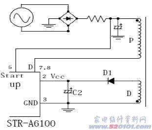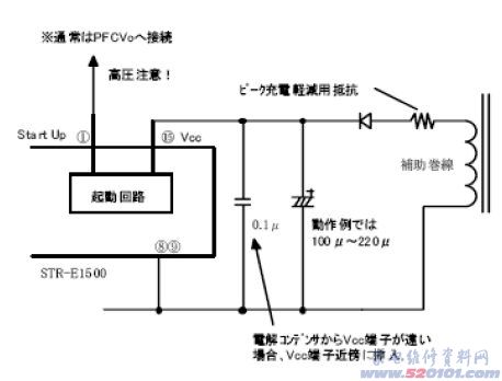 (图2-3)是由StartUp端子连接到输入电压经整流后的直流电压部分而构成。从StartUp端子输入的电流被IC内部电路定电流处理后(800μAtyp),经IC内部给连接在Vcc端子的电容C2充电。电源的起动是在Vcc端子电压上升到动作开始电源电压Vcc(ON)=17.5V(typ)时,开始动作的。到动作开始为止的起动时间仅由电容C2决定,而和StartUp端子的直流电压无关。