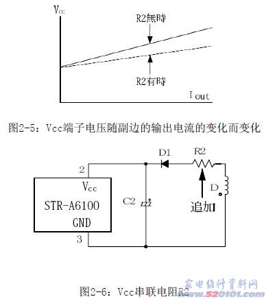 辅助绕组D在电源正常动作的状态下的电压,请设定在使电容C2两端的电压在动作停止电压Vcc(OFF)=10V(typ)和OVP动作电压Vcc(OVP)=31V(typ)之间。通常情况下,辅助绕组D的电压设定在15V-20V范围内。另外,在实际的电源电路中,有时会出现如图2-5所示的Vcc端子电压随副边的输出电流的变化而变化的现象。这是由于STR-A6159M的控制电路的消耗电流小,MOSFET关断瞬间产生的浪涌电压(随负载的增大而增大)给电容C2充电的缘故。如图2-6所示,与整流二极管D1和D之间串联一个数Ω至数十Ω电阻R2,对解决这个问题很有效。