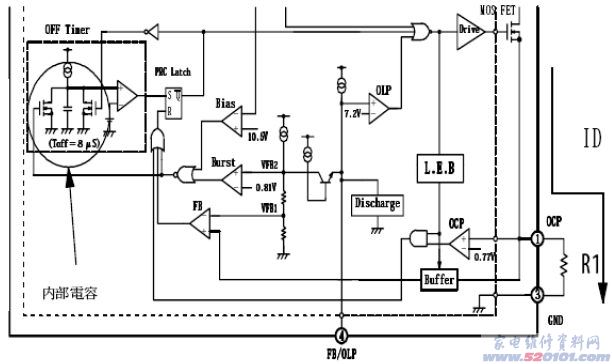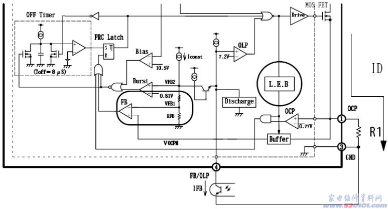 定电压控制是,通过副边的误差放大器控制光电耦合器、使光电耦合器的晶体管,从FB/OLP端子分流出与负载相应的反馈电流IFB。从FB/OLP端子分流出反馈电流IFB后,比较器的负端的电压即为与负载相应的控制电压,表示为VFB1。另一方面,比较器的正端的电压是与漏极电流波形同样的电压VOCPM、FB比较器以电压VFB1为基准,控制电压VOCPM峰值,即控制漏极电流峰值,我们称之为电流控制方式。具体的讲,当负载减轻时,副边的误差放大器输出的控制信号量增加,光电耦合器的晶体管分流出的反馈电流IFB也随之增加。反馈电流IFB的增加使流入电阻RFB的定电流Iconst因IFB的分流而减少,从而使FB比较器的负端所接的电阻RFB的电压降低。因此,由于FB比较器的基准电压VFB1降低,在与之相应降低了的漏极电流峰值时,FB比较器的输出信号使PRCLatch复位,功率MOSFET被关断,实现对输出电压的控制。当负载增加时,将以与上面相反的动作来实现输出电压的控制。一般的电流控制方式,MOSFET导通时产生的浪涌电流噪声容易引起误动作,STR-A6159M为此设定了Leadingedgeblanking期间Tbw=200nsec(TYP),对导通时产生的漏极浪涌电流加以屏蔽,以抑制误动作的发生。