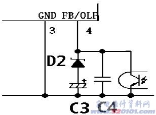 和OCP动作一样,OLP动作后会由于UVLO动作而进入间隙振荡状态,但当过负载状态被解除时,会自动返回,恢复到通常的动作状态。和电容C3串联接入的齐纳二极管D2,是为了防止在正常动作状态时电容C3被充电而接入的。(没有接入齐纳二极管D2时,由于和光电耦合器并联的电容C3的电容值较大,该端子FB功能对负载变动的响应会变坏。)因此,齐纳二极管D2的电压要选择在正常动作时,齐纳二极管D2不会被导通的电压。通常,齐纳二极管D2的电压的最佳选值范围为4.7V-6.2V之间。电容C3的选定,必须使从过负载状态开始到开关动作停止的时间,比电源起动的时间长。(如果从过负载状态开始到开关动作停止的时间,比电源起动的时间短,电源将不能起动。)从过负载状态开始到开关动作停止的延迟时间TDLY,可根据下列表达式求出大概值。TDLY=C3*(VOLP(MIN)-VZ-VF)/IOLP(MAX)。VZ:齐纳电压,VF:齐纳二极管的正向电压。最终的电容C3和齐纳二极管D2的选择,请根据电源实际的评价结果决定。