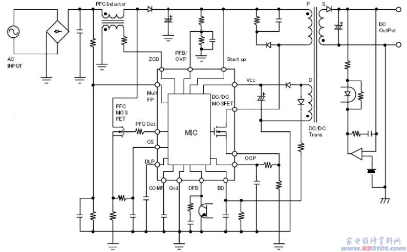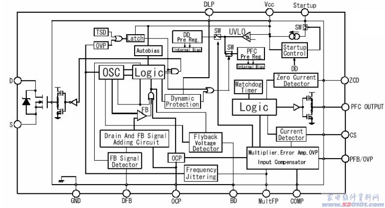 2)PFC控制部分①:临界导通电流模式(CCM);②:内藏乘法器用于AC输入校正;③:高速OVP(非锁死模式);④:输出电压可变。