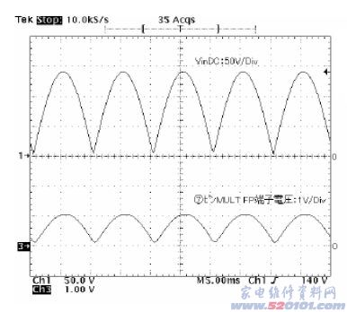 MultFP是乘法器的输入端子。输入电压先经全波整流,再通过分压输入该端子。该电压波形在使输入电流波形正弦化的过程中起到重要作用(图2-14)。[Page]