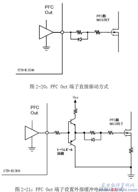 STR-E1555的PFC部分的功率MOSFET接在IC外部。PFCOut端子输出外接MOSFET的驱动信号。该端子的输出特性为Source300mA,Sink500mA。根据所使用的MOSFET特性,确定是采用直接驱动方式(图2-20)或者设置外部缓冲电路驱动方式(图2-21)。