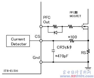 该端子用来检出PFC部分MOSFET流过的漏极电流Id。PFC部分功率MOSFET的源极一侧,装入耐浪涌特性好的金属板电阻等器件,将漏极电流Id转换成电压。为了在这个时候避免导通时产生浪涌电流等不稳定动作,插入CR滤波器(图2-23),但是,由CR滤波器确定的时间常数如果过长,可能会延缓电流检出,导致电源损坏。请在实机上调整,若没有误动作等,请设定尽量小的值。另外,STR-E1555用在AC200V系时,为防PFC部分输出功率过高,CS端子的阈值是在AC100V系/1.4V和AC200V系/0.65V自动切换。检出电阻RS按照AC100V系设定。因为PFC部分MOSFET的Id峰值是在正弦波上取到的,计算峰值电流设定检出电阻。