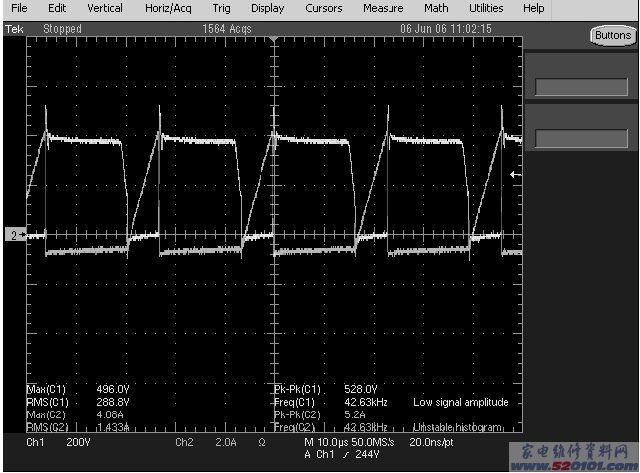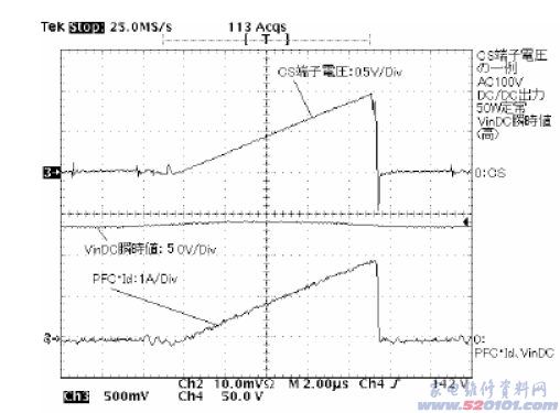 PFC部分的漏极电流Id和输入电流形成同样的正弦波状,但当它的最大值达到CS端子的阈值后,Id受到限制,波形畸化,立刻可以判別出来。另外,图2-24是未达到阈值的平常状态。
