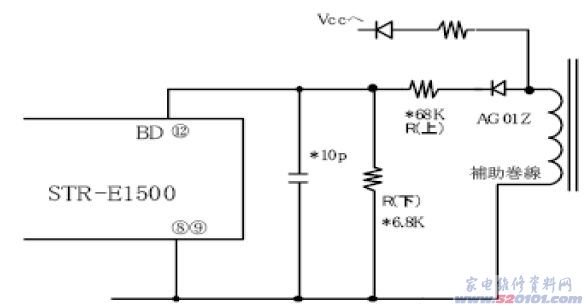 在STR-E1555的工作模式当中,准共振模式下,必须对电压共振进行底部检出,加入延时后导通。图7-28是进行底部检测(BD)的回路。和一般的准共振模式调整延迟时间的方法一样,最终要在实机的电源上,根据实际测得波形,进行参数调整。BD端子的输入阈值电压是0.76V(typ)。如果该端子的输入信号波形低于此阈值,则IC从准共振动作进入100KHz的PWM。根据辅助绕组的输出电压设定,参考图2-28中的参数,信号波形的振幅设定在阈值的2倍。延迟时间是由DC-DC部分主变压器的Lp和电压共振电容容量C所决定。准共振动作时,辅助绕组的电压假定为20V,信号振幅的设定大约由(20V-Vf×(分压电阻(下)/分压电阻(上))所决定,在实际动作时调整。根据图7-28中的参数,大约得到1.9V。另外,BD端子的下降波形达到阈值0.76V时导通。请通过微调分压电阻,调整底部导通时间。图2-28中的延迟电路对于辅助绕组可以看作是一组负载,考虑到此电路的功耗,请使用高阻值的电阻。但是,不可以忽视由于高阻抗所带来的噪声影响。因此参照图2-28中追加滤波电容,但是作为延迟要素的延迟时间减小时,可能出现不能调整到最佳状态的情况。该情况下,请增大变压器的Lp值或者电压共振电容的容量C,使延迟时间本身变大。[Page]