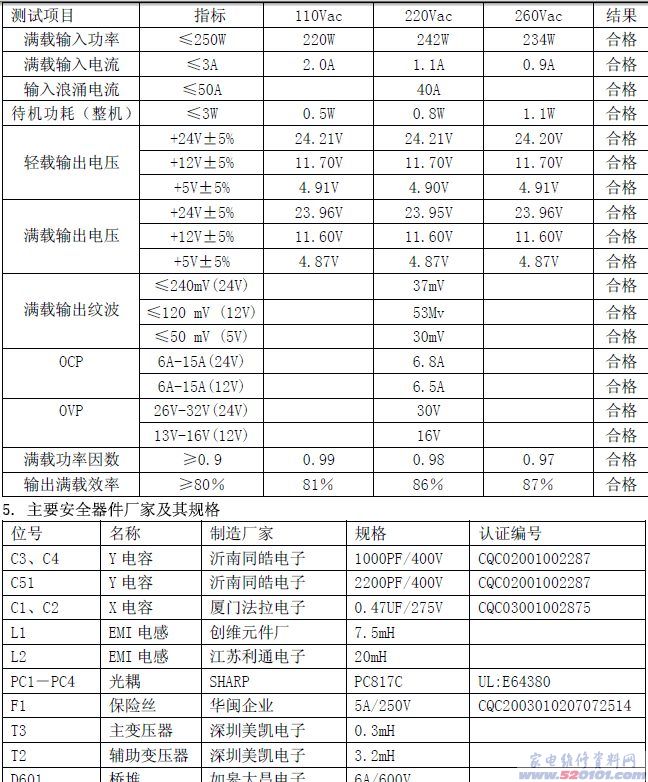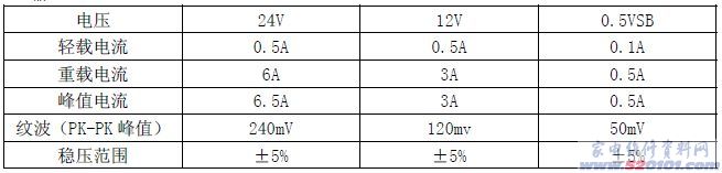 1)输出STANDBY为高电平触发,电压不得低于2V。在测试纹波和杂讯时需在每组输出端并联一个0.1uf的瓷片电容和10uf的电解电容。采用20MHZ的示波器和同轴探头去测量。2)测试数据轻载:ON/OFF端接入5V电压,按+24V/0.5A+12V/0.5A+5V/0.2A接入阻性负载重载:ON/OFF端接入5V电压,按+24V/6.0A+12V/3.0A+5V/0.5A接入阻性负载