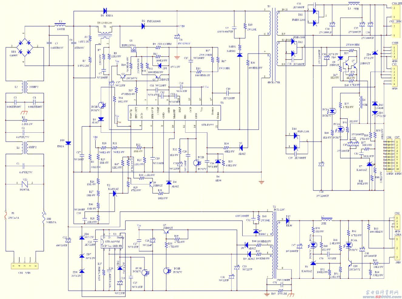 本电源设计功率200W,采用开放式自冷却结构,专配创维37寸液晶电视。电路结构上采用待机电路+PFC部分+DC-DC部分组成。待机电路采用三肯(SANKEN)公司的STR-A6159M。PFC部分和DC-DC部分采用该公司的STR-E1555芯片,此芯片集成PFC部分和DC-DC部分。具备输入欠压保护,输出过流保护,过压保护,防浪涌电流冲击,防雷击等多项保护措施。