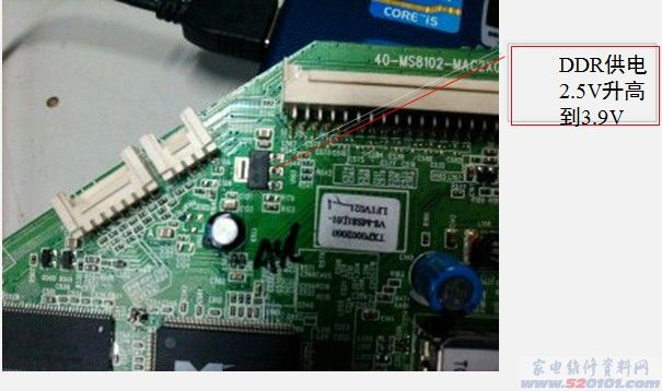 分析与检修:开机后红灯亮,按键遥控都开不了机,测量P100插座处3.3V和 12V正常,说明电源板已工作正常,故障出在数字板上,首先检查主板上各供电稳压IC,U102(RT9166-3.3V)、U103(AS1117-2.5V)、U105(AS1117-3.3V)的输出电压,当测量到U103时输出电压为3.9V明显不正常,正常时为2.5V给DDR供电的,更换U103后电压恢复正常故障排除。 此故障已发现多例