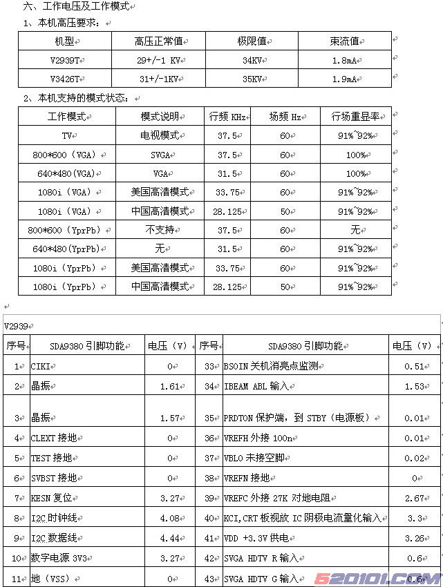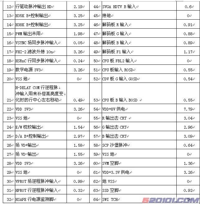 1脚:外部时钟信号输入;2脚:振荡基准输出;3脚:振荡基准输入;4脚:内外时钟信号切换;5脚:正常工作模式和测试模式切换;6脚:基片脚;7脚:复位输入;低电平复位。8脚:时钟线;9脚:数据线;10脚:3.3V供电;11脚:地;12脚:行驱动脉冲输出;13脚:H35K;频率控制脚。14脚:H38K;频率控制脚。15脚:调制脉冲宽度控制信号输出;16脚:场同步信号输入;17脚:单(低电平)双(高电平)行频切换;18脚:行同步输入;19脚:3.3V供电;20脚:地;21脚:行逆程脉冲输入;22脚:3.3V供电;23脚:地;24脚:东西校正信号输出;25脚:受控I²C总线直流电压输出,频率控制;26脚:直流耦合场输出模块控制信号输出;27脚:直流耦合场输出模块控制信号输出;28脚:3.3V供电;29脚:地;30脚:场输出模块状态监测;31脚:高压监测;32脚:B+监测,当行驱动频率降低时;33脚:关断暗电平初始值输入;34脚:束流ABL输入;35脚:行场保护脚,行场保护起作用时变为高电平;36脚:场基准电压,本机没用;37脚:场消隐输出;38脚:基准地;39脚:基准电流输入,没有;40脚:暗电流输入;41脚:3.3V供电;42脚:Y/R输入;43脚:U/G输入;44脚:V/B输入;45脚:地;46脚:R1/Y1输入;47脚:G1/U1输入;48脚:B1/V1输入;49脚:RGB1快速消隐输入;50脚:RGB2快速消隐输入;51脚:R2输入;52脚:G2输入;53脚:B2输入;54脚:RGB输出模拟供电(+8V);55脚:R输出;56脚:G输出;57脚:B输出;58脚:行及彩条消隐信号,没用到;59脚:RGB模拟地;60脚:扫描速度调制信号输出;61脚: 3.3V供电;62脚:地;63脚:使软启动失效;64脚:用于控制开关的I²C总线输出;