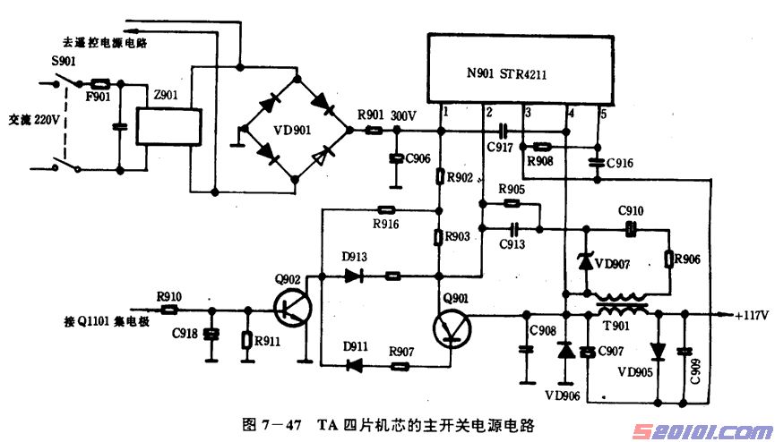 300V 直流电压分两路送往负载电路:一路加到 STR4211 厚膜电路(1)脚内部的开关管集 电极上,另一路经 R902、R903 启动电阻加到 STR4211(2)脚内部的开关管基极上,从而使开 关管导通,电流从 STR4211(4)脚的开关管发射极流出,经储能变压器(即开关变压器)T901 的初级绕组给 C911 充电,T901 正反馈绕组的电压经 R906、C910、C913、R905 加到 STR4211