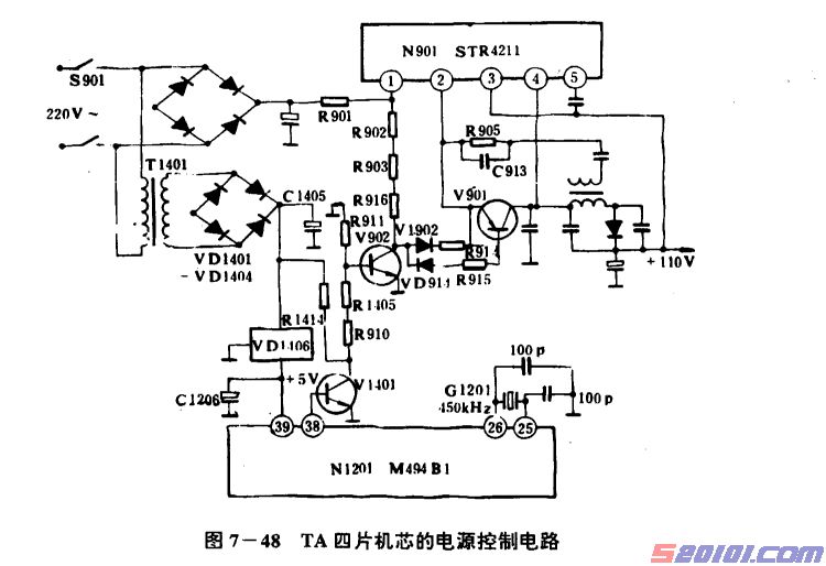 TA 四片机芯系列彩色电视机的电源控制电路见图 7—48 所示。