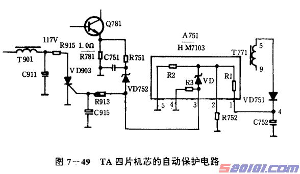 图中 Q781 为行输出管,其发射极经检测电阻 R781 接地,VD752 是击穿值为 6V 的稳 压管。在正常工作情况下,R781 上的平均电压值低于 6V,VD752 是不会导通的。一旦行 输出管 Q781 发生过流,R781 上的压降过高时, VD752 就击穿导通,可控硅 V903 被触发导