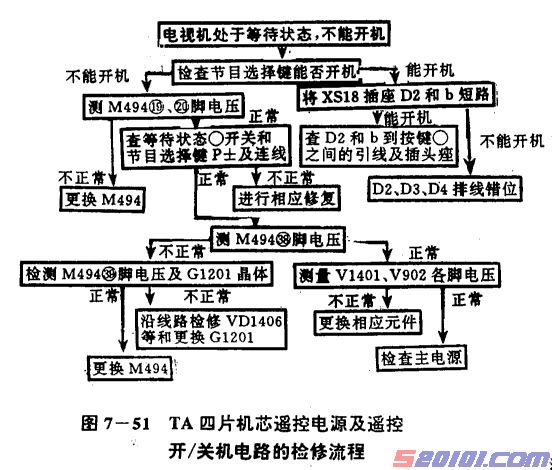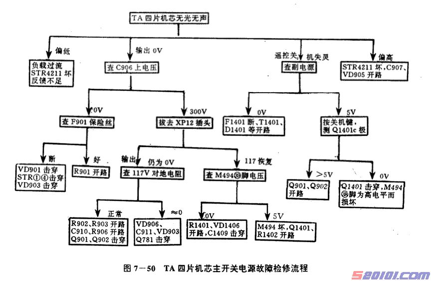如 STR4211 内部稳压电路损坏、或正反馈量不足、滤波电容 C911 漏电或失效等。 以上各步的具体检修流程见图 7—50 所示。
