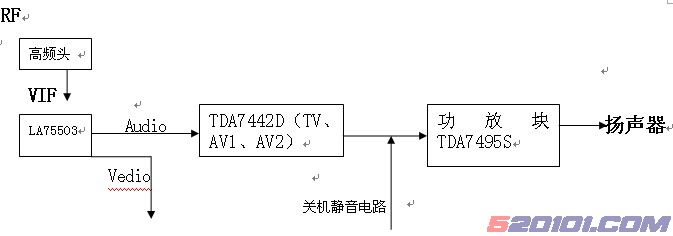 电视射频信号经过高频头U101接收、混频出38M、经过预中放放大、然后经过声表带通滤波然后输入给中放LA75503,解调后输出复合视频信号和音频信号。视频信号进入解码板N100(HTV180)解码,音频信号也先进入解码板N114(TDA7442D)选通和处理后,进入主板功放N602(TDA7495S)输出。