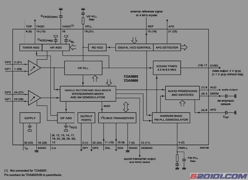 TDA9885/TDA9886是PHILIPS公司的中频处理IC,两者均支持(PAL、NTSC), TDA9886增加支持SECAM功能,本机采用的是TDA9886,该中频块的具体功能如下: