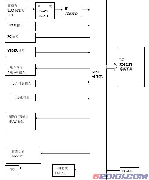 该机采用MST 9U19B 机芯,也称之为“M9机芯”。“69”系列外壳,是公司的一款高档电视。采用LG PDP32F1(852*480)等离子屏,