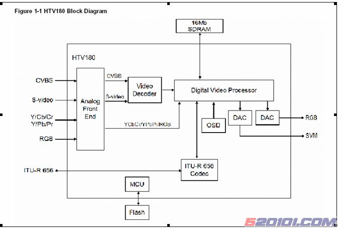 HTV180是一个高集成化的芯片,它同时具有AD转换,视频信号解码,CPU,隔行变逐行等功能