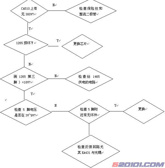解码板上(TB1306)第18脚输出枕校抛物波到MOS管V401的G极,经MOS管放大后输出,通过L404调制行电流。R422,R423,R424,R425从V401的D极取样后反馈给TB1306第20脚。如果反馈电路断开,则屏幕上会出现严重的桶形失真,长时间有可能损坏V401,另外需要注意的是V401 D极到G极的反馈为交流反馈。