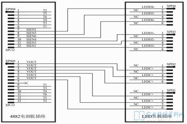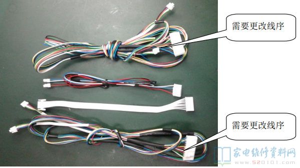 下图以 RSAG7.820.4882 电源板为例介绍跳线方法,其他采用此种插座连接的电源板接线方式相同。线序更改参考图如下,请按照颜色对应连接: