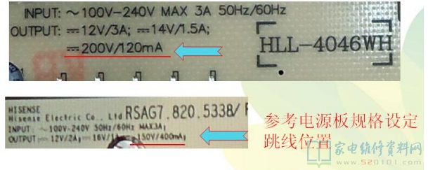 上面跳线就是调整实际接入到电源板的 LED 数量,以 32 寸电源板 4723 为例,它的 LED 驱动输出电压为 135V,那么我们就调整工装电压到 125V 或者 145V均可,因为电源板输出电压有一定误差范围,同时是 2 路输出,这样就需要对称调整 LEDA-与 LEDB-的跳线到适合位置。