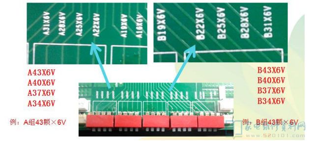 例如:波段开关选择到 A43X6V , 那么就代表 A 组的 LED 选中了 43 颗,每颗的电压是 6V,总电压就是 43x6 。
