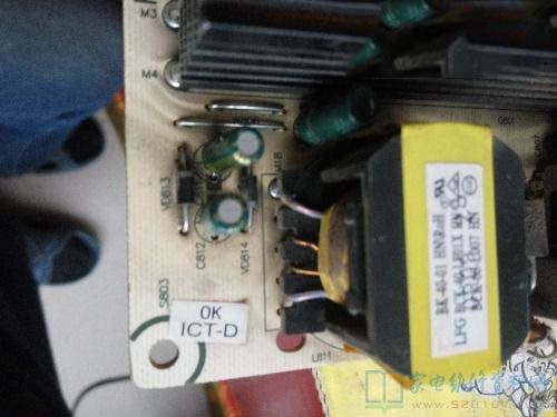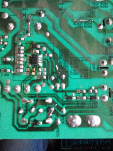 故障检修:拆开机器,测量电源板5v正常12v 24v有了就没反复,拿回电源板再试机,24v有一下就再也没有了,和在用户家试机不一样,找了吹风机加热,24v开始反复,有人说是电容c811 c812故障,拆了测量了一下也没问题,但是用电吹风吹这两个电容的时候电压变化明显,换了这两个电容之后,电压就正常了,说明这个板的通病就是这电容坏,测量不准,直接更换后,故障排除。
