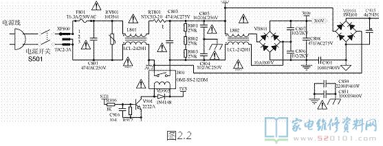 在图2.2中C801、L801、C803、C804、C805、L802是抗干扰元件,RV801是压敏电阻;当出现供电电压异常过压时;RV801则击穿;保险丝F801熔断保护了整机电路的安全。
