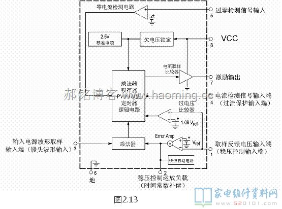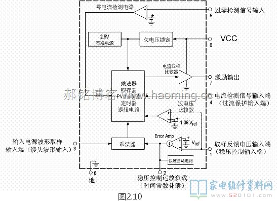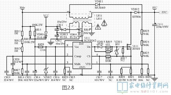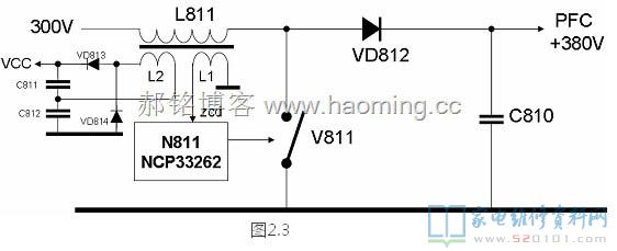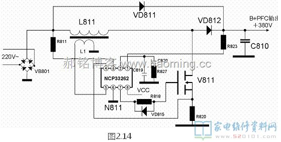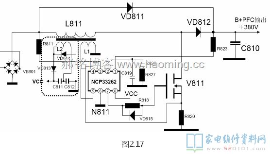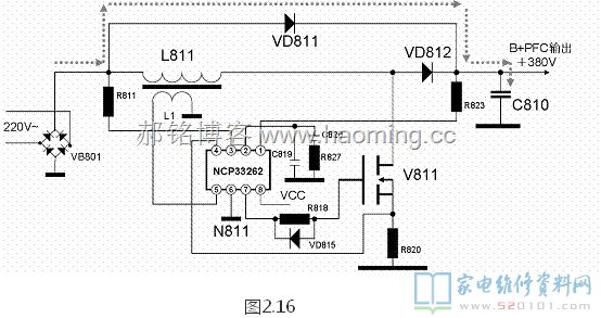 上面介绍了PFC开关电源的储能元件L811、开关元件V811、整流元件VD812的工作原理。正常工作开关管V811还必须有专门的激励电路, 开关管V811的激励是由一块专门设计的PFC激励集成电路完成的,图2.9中N811 NCP33262就是开关管V811的激励集成电路。