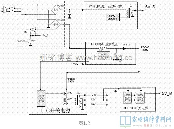 4、 LLC开关电源:由PFC+380V供电输出24V(背光供电)、12V(数字电路供电)、18V(伴音功放供电)