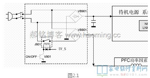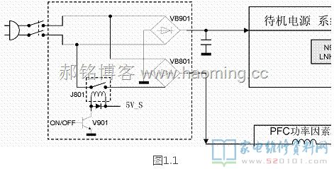 220V交流市电经电源开关进入输入电路后分两路进入VB901、VB801两只整流桥堆电路,一路直接进入VB901;经过整流及C903滤波后送入5V_S待机开关电源作为+B供电。另一路经过继电器J801进入VB801整流后(未经整流)送入PFC开关电源作为PFC开关电源的+B供电,继电器控制电路由V901组成;受CPU送来的ON/OFF信号控制。