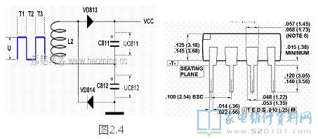 图2.3中N901是开关电源模块型号是LNK564(图中误为:LINK564),这是一块专门为待机电源设计的低功耗、低功率开关电源模块,内 置MOS开关管,输出功率仅为3W,只能为CPU提供5V 0.5A左右的VCC电源,本机采用的LNK564采用DIP-8B封装(LNK564还有一款SMD-8B贴片封装),外形及尺寸图2.4所示。