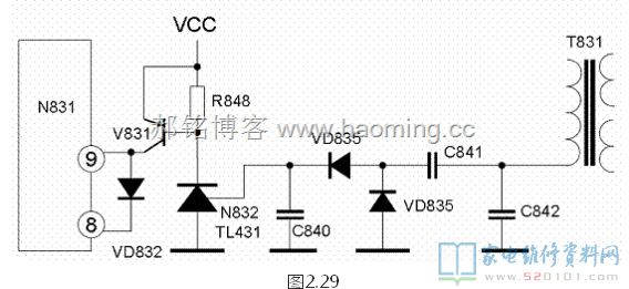 (1) 功率输出电路过压保护电路由C841、R850、R851、VD835、VD834、R852、R853、C840、N832、VZ832、R845、 V831、R846等组成。其中C841、R851、R850、VD834、VD835、C840组成半波倍压整流电路,图2.29所示。当功率放大电路 出现异常电压升高时;倍压整流电路输出电压也升高,该电压加到比较电路N832 TL431的控制端,N832电流增大输出端电压下降,并引起V831导通,V831的导通把VCC电压经过R844、V831加到N831的9脚,并经 过VD832、R840加到N831的8脚这两脚的电压上升,内部的激励电路被关闭,输出电路停止工作。
