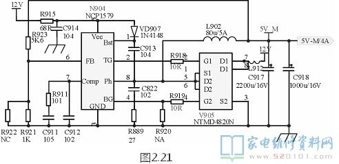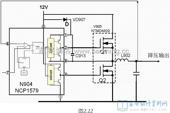 图中;N904 NCP1579 是激励集成电路,V905是功率开关模块(内含两只N沟道的MOS开关管),L902是开关电源的储能电感,图2.22清楚的显示了N906和V905及电路的组合结构。