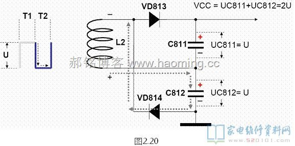 当L811的L2感生电压U为T2时间;图2.20所示,L2电压为 上负下正 ;此时电流经过L2、VD814流通并对C812充电,C812上面的充电电压UC812电压幅度为 U (此时VD813反偏截止)。