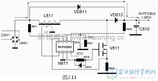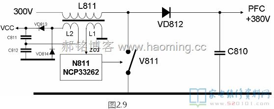 此电路的主要功能是用不经过滤波的脉动直流电压作为+B供电,产生稳定的+380V电压输出作为其它电路的+B供电电源。并且该PFC电路还要产生 其它电路的VCC(18V)供电(图2.29中L2绕组、VD813、VD814、C811、C812组成的倍压电路输出18V的VCC电压)。
