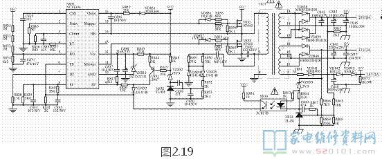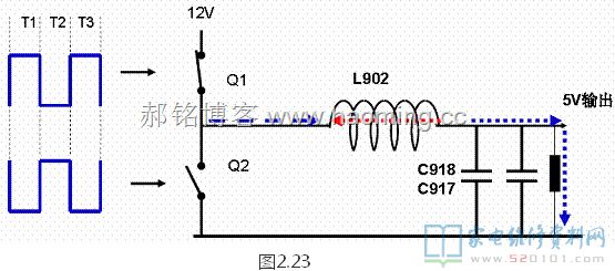 图2.22中N904是开关电源的振荡激励集成电路,2脚和4脚输出相位反相的激励控制信号,加到功率开关模块V905的Q1和Q2的栅极,促使Q1、Q2轮流导通。 12V电压经过Q1、Q2轮流导通;向负载供电,L902是能量存储元件。N904的6脚是稳压控制脚,连接于5V输出端。根据输出电压的变化改变2脚和 4脚输出信号的占空比。