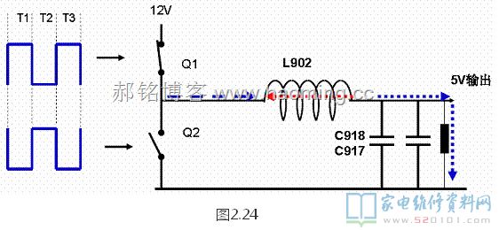 在T2时间;激励集成电路的4脚输出为正;2脚输出为负时;图2.25所示;Q1断开Q2导通;L902的自感电势方向为左负右正,此自感电势经过 负载及Q2流通,继续对负载供电,L902逐步释放存储的能量,当输出电压低于5V时,输出经过取样反馈进入N904的6脚,控制激励输出信号相位反转; 进入T3时间。