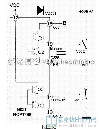 图 2.32 N+N沟道功率放大电路的基本工作条件之一就是N831的16脚电压必须随着上桥开关管V832的工作;在15V和395V之间浮动,才能保证整个功率输 出电路的正常工作,这个浮动就是由VD831和C836组成的自举升压电路来完成的,下面对图2.32自举升压电路的工作原理进行分析。