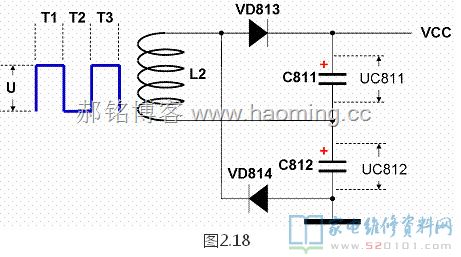 L2绕组的感生电压经过VD814、VD813、C811、C812组成的倍压整流输出18V的VCC供电。