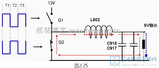 在T1时间;激励集成电路的2脚输出为正;4脚输出为负时;图2.24所示;Q1导通Q2断开;12V电压经过Q1、L902流通,对负载供电,流 过L902的电流逐步上升;输出电压即逐步上升至5V,此时;L902流过的电流产生的自感电势方向为左正右负,并以磁能的形式存储。当输出电压达到5V 时,输出经过取样反馈进入N904的6脚,控制激励输出信号相位反转;进入T2时间。图2.25所示: