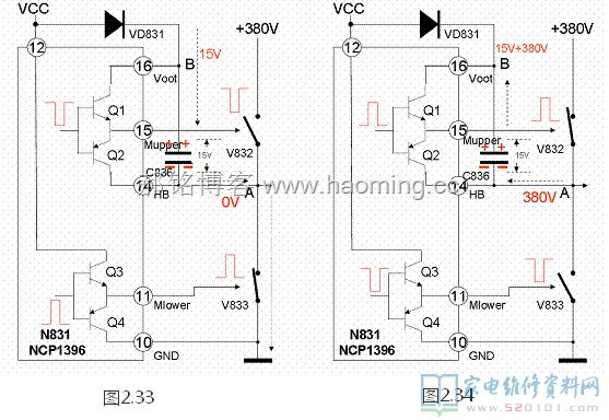 这种N+N沟道功率放大电路的激励信号的直流份量的获取一般采用了“自举升压电路”来完成。在图2.27中,集成电路N831的16脚是上桥开关管 激励电路的VCC供电端(Vboot),在电路中他并没有直接接15V的VCC供电,而是经过二极管VD831再连接于15V VCC供电端,16脚另接一只电容器C836到上桥开关管的源极(功率输出端),此二极管VD831称为自举升压二极管;此电容器C836称为自举升压电 容。图2.32所示