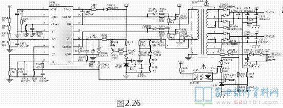 液晶电视机的主要供电;24V/8A背光板供电,12V/2A信号处理电路供电,18V/2A伴音功放供电;一个LLC开关电源提供,其组成是由 N831 NCP1396振荡激励集成电路和V832、V833组成的单端功率输出开关电路及输出开关变压器T831、输出整流电路组成。图2.26所示,是此部分 的电路原理图。电路具有稳压控制、输出过压保护、供电380V欠压保护,及输出短路保护。