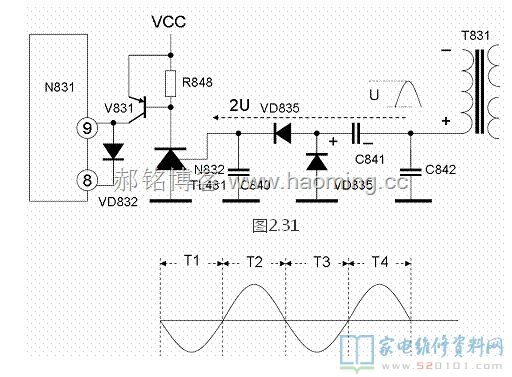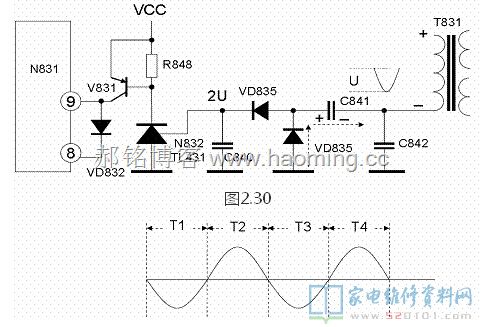 在T1时间;图2.30所示;幅度为:U的正弦波负半周加到C842、VD835,VD835导通并对C842