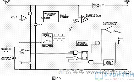 从上图2.5可以看出;引脚BP是VCC供电脚,引脚D是MOS管的输出脚,在BP脚和D脚之间有一个降压的恒流源电路REGULATOR 5.8V , 在开机的瞬间经过这个电路;向3脚外面的C906 22微法电容器充电,当充电电压达到5.5V以上时电路启动,电路开始工作,T901的1、2绕组感应电压经过VD902整流及C906滤波后向N901 的3脚(BP)提供一个稳定的VCC供电。