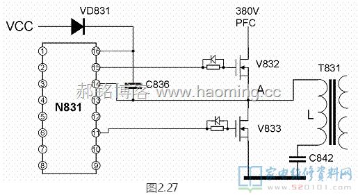 图2.27所示, 就是此LLC开关电源的等效电路,图中开关变压器T831的初级L和电容器C842组成一个串联谐振电路,此串联谐振电路连接于功率输出管V832、V833的输出端A。